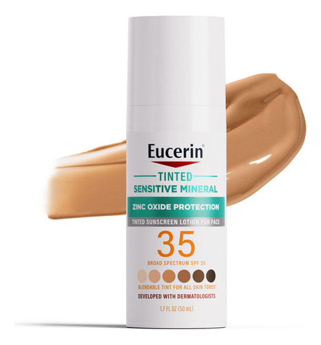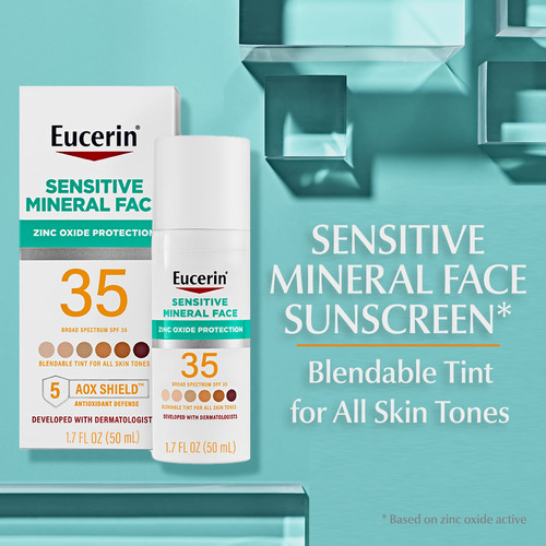 Loção protetora solar facial Eucerin Sun Tinted Mineral FPS 35, protetor solar mineral não comedogênico com proteção suave de óxido de zinco para peles sensíveis, frasco de 1,7 fl oz – Protetor solar de óxido de zinco: fórmula suave de protetor solar facial com proteção UVA/UVB de amplo espectro baseada em um filtro mineral (óxido de zinco de origem natural (1)) – 5 AOX Shield Fórmula: este protetor solar mineral colorido com óxido de zinco é enriquecido com 5 antioxidantes (Ácido glicirretínico, licochalcona A, vitamina E, vitamina C, Oxynex ST) — Combina com todos os tons de pele: o hidratante facial colorido com FPS 35 é leve , seca e combina perfeitamente com todos os tons de pele – Adequada para peles sensíveis: desenvolvida com dermatologistas, esta fórmula hipoalergênica é segura para peles sensíveis e adequada para uso diário sob maquiagem – Livre de: protetor solar colorido para rosto é livre de fragrâncias, corantes, parabenos, PABA, ftalatos, oxibenzona e octinoxato – Recomendado por dermatologistas: Eucerin é dermatologista marca de cuidados com a pele recomendada, baseada na ciência, fornecendo ingredientes avançados que cuidam da pele