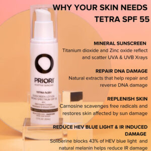 Esse produto extraordinário oferece quatro níveis de proteção contra a dureza do seu ambiente. O protetor solar mineral colorido Tetra fx251 é formulado para se misturar perfeitamente à sua pele, suavizando linhas finas, poros e descolorações, ao mesmo tempo em que oferece proteção SPF55 e protege sua pele da luz azul visível de telefones celulares e outros dispositivos eletrônicos. Esta fórmula de várias camadas é enriquecida com protetor solar mineral de amplo espectro, complexo de proteção infravermelha exclusivo e enzimas de reparo de DNA. Ótimo para todos os tipos e tons de pele. – PROTEÇÃO SOLAR SEGURA PARA RECIFES: proteção mineral UVA + UVB de amplo espectro SPF 55: óxido de zinco e dióxido de titânio. Feito nos Brasil com ingredientes que adoram a pele dos recifes. – LUZ AZUL (HEV) E PROTEÇÃO INFRAVERMELHA: protege a pele da radiação infravermelha e da luz azul de alta energia visível (HEV) de telefones celulares e outros dispositivos eletrônicos – REPARO DE DNA E PROTEÇÃO GENÉTICA: contém ingredientes totalmente naturais, como algas azuis e verdes e sementes de mostarda, para ajudar a prevenir o envelhecimento prematuro da pele e neutralizar os danos causados por poluentes ambientais. – PROTEÇÃO AVANÇADA: feita com SOD e Ergotioneína para restaurar e reabastecer as células afetadas pelos danos causados pelo sol. – NOVA TONALIDADE COLORIDA: A fórmula hidratante combina perfeitamente com a pele, suavizando e corrigindo linhas finas, poros e manchas escuras sem deixar um tom branco.