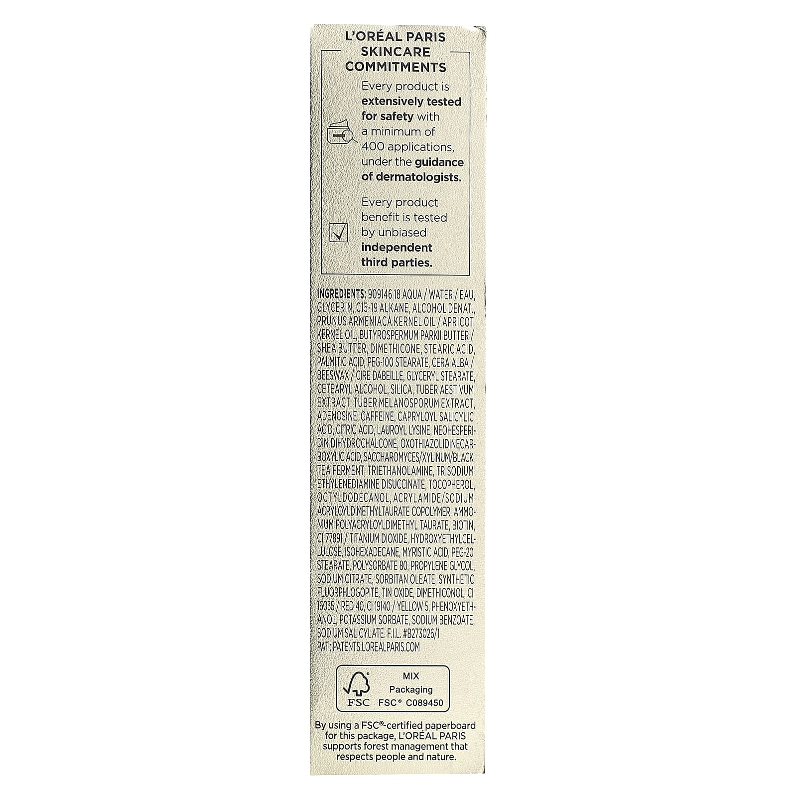 Água, glicerina, alcano c15-19, álcool desnat., óleo do caroço de Prunus armeniaca / óleo do caroço de damasco, manteiga de karité com butyrospermum parkii, dimeticona, ácido esteárico ácido palmítico, estearato de PEG-100, cera alba / beeswax, monoestearato de glicerila, álcool cetoestearílico, sílica, extrato de tubérculo aestivum, extrato de Tuber melanosporum, adenosina, cafeína, capryloyl salicylic acid, ácido cítrico, lauroil lisina, neohesperidina dihidrocalcona, ácido oxotiazolidinocarboxílico, fermento de chá preto/saccharomyces/xylinum, trietanolamina, trisodium ethylenediamine disuccinate, tocoferol, octildodecanol, copolímero de acrilamida/acriloildimetiltaurato de sódio, taurato de poliacriloildimetila de amônio, biotina, CI 77891/dióxido de titânio, hietelose, isohexadecane, ácido mirístico, estearato peg-20, polissorbato 80, propilenoglicol, citrato de sódio, oleato de sorbitana, synthetic fluorphlogopite, óxido de estanho, dimeticonol, ci 16035 / vermelho 40, ci 19140 / amarelo 5, fenoxietanol, sorbato de potássio, benzoato de sódio, salicilato de sódio.