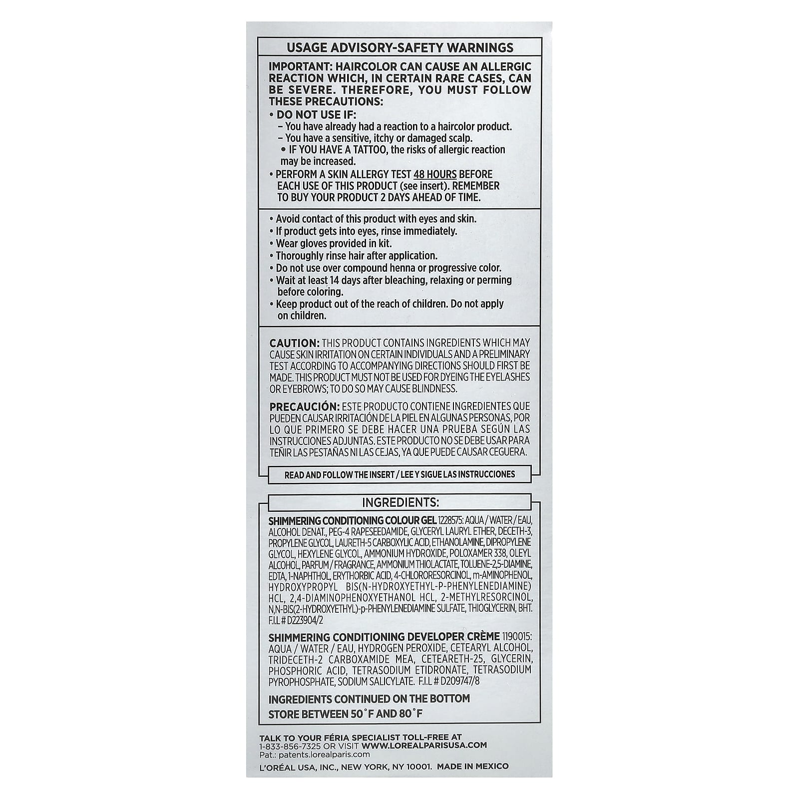 Gel de cor condicionador cintilante: Água/aqua/eau, álcool desnat., colzaedamida peg-4, éter laurileterglicerídeo, deceth-3, propilenoglicol, ácido carboxílico laurileter-5, etanolamina, dimetildietilenoglicol, hexylene glycol, hidróxido de amônio, poloxâmero 338, álcool oleílico, perfume /fragrância, tiolactato de amônio, tolueno-2,5-diamina, edetato, 1-naftol, ácido eritórbico, 4-chlororesorcinol, m-aminofenol, cloridrato de bis(n-hidroxietil-p-fenilenodiamina) de hidroxipropil, cloridrato de 2,4-diaminofenoxietanol, 2-metilresorcinol, sulfato de n,n-bis(2-hidroxietil)-p-fenilenodiamina, tioglicerina, bht.