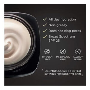 • Proteção FPS de amplo espectro: apresenta um protetor solar FPS 25 de amplo espectro para proteção contra os raios UVA e UVB prejudiciais que causam o envelhecimento precoce da pele. A vitamina E ajuda a reforçar a barreira de hidratação da pele.