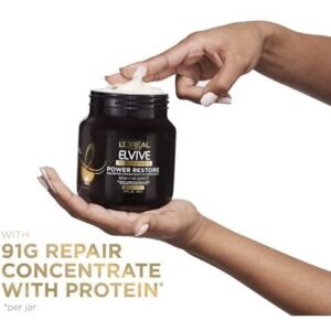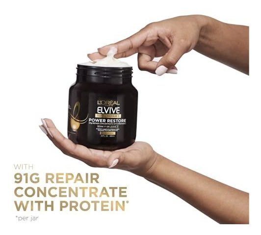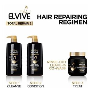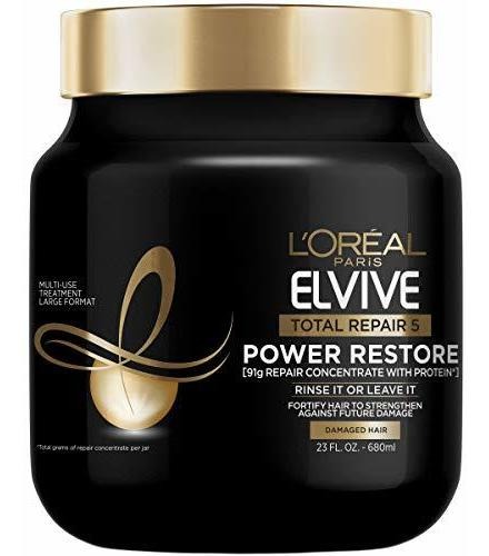 Hair thats worth it, is worth repairing. LOreal Paris Elvive Total Repair 5 strengthening system of shampoo, conditioner, and treatments fights the 5 signs of damage: weak, fried, brittle, tangled, and split-ends. Total Repair 5 Repairing Shampoo repairs damaged hair without the weigh down, Total Repair 5 Repairing Conditioner creates a perfect synergy with the Repairing Shampoo combining intense care with lightness, Total Repair 5 Power Restore Multi-Use Treatment acts as a leave-in conditioner, rinse-out mask, and co-wash helping fortify hair to strengthen against future damage, Total Repair 5 Damage Erasing Balm rinse-out mask deeply conditions and reinforces hair, and Total Repair 5 Protein Recharge leave-in conditioner helps recharge strength and protect against up to up to 450 heat.*Total grams of repair concentrate per jar*