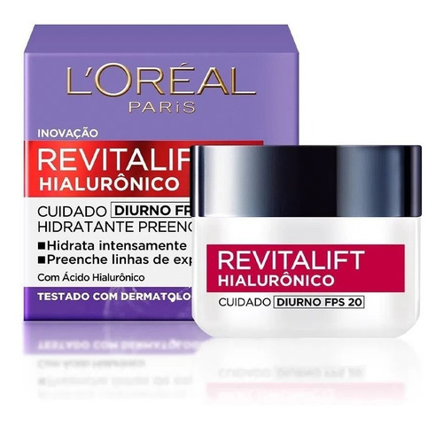 Descrição O Creme Facial Antirrugas Revitalift Hialurônico contém Ácido Hialurônico Puro, que hidrata sua pele intensamente durante 24h+, preenchendo as linhas de expressão. Promove proteção solar FPS 20. Testado dermatologicamente. Para todos os tipos de pele. . Modo de uso: Aplicar diariamente fazendo movimentos circulares ascendentes no rosto e pescoço previamente limpos. . Precauções: Não aplique perto da área dos olhos. Em caso de contato com os olhos. Enxágue imediatamente. Manter fora do alcance de crianças. Se observar qualquer reação adversa, suspender o uso. Se persistir, consulte seu médico. Garantia do vendedor: 1 meses