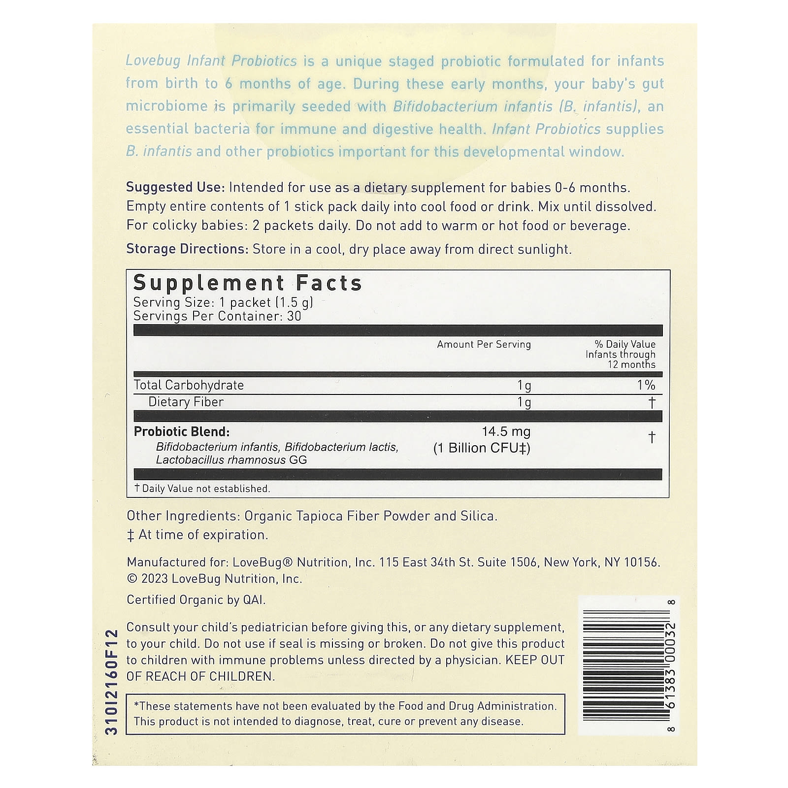Os Probióticos para Bebês da Lovebug são um probiótico único formulado para bebês até 6 meses de idade. Durante esses primeiros meses, o microbioma intestinal do bebê é semeado principalmente com Bifidobacterium infantis (B. infantis), uma bactéria essencial para a saúde imunológica e digestiva. Infant Probiotics fornece B. infantis e outros probióticos importantes para essa janela de desenvolvimento.