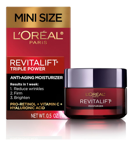 O hidratante facial antienvelhecimento LOréal Paris RevitaLift Triple Power Travel Size, Pro Retinol, Ácido Hialurônico e Vitamina C, reduz as rugas. Amostra de 0,5 oz do Creme de Dia Antienvelhecimento