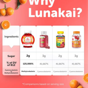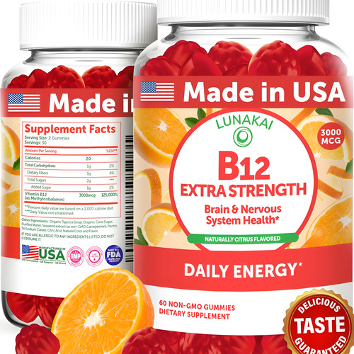 Gomas Lunakai Extra Strength de Vitamina B12 de 3000 mcg Fabricadas nos Brasil, deliciosas gomas diárias para estimular a energia e o metabolismo Suplemento vegano de metilcobalamina B12 (60 unidades)