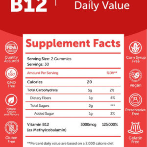 Aumente sua energia naturalmente com nossas gomas de vitamina B12, que fornecem uma dose potente de 3000 mcg de metilcobalamina para melhorar seus níveis diários de energia e mantê-lo ativo durante todo o dia. Ideal para quem busca um aumento constante de energia. Além disso, nossas gomas apoiam o bem-estar geral e a função cerebral, apoiando os processos metabólicos naturais do corpo e promovendo a saúde cognitiva. Desfrute de seu delicioso sabor cítrico em uma forma mastigável, uma alternativa saborosa e conveniente às pílulas tradicionais.
