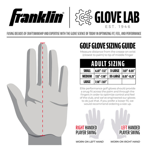 Franklin Sports Pro Golf Gloves are the perfect addition to any golf bag to help perfect your swing with comfort and style. Made from genuine sheepskin Cabretta leather, these gloves are built for a responsive, comfortable feel while providing unmatched grip for premium performance. Perforations in the fingerbacks and knuckles make these gloves breathable, while the one-piece palm construction reduces bunching and blisters so your hands can be cool and comfortable all day long. Plus, the 100% leather construction ensures that these gloves are built to last, so no matter how many swings you take, these gloves will be up to the test year after year. So if youre ready to take your golf game to the next level, grab yourself a Franklin Sports Pro Golf Glove and hit the links today!
