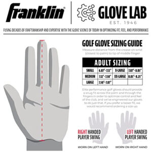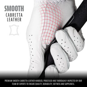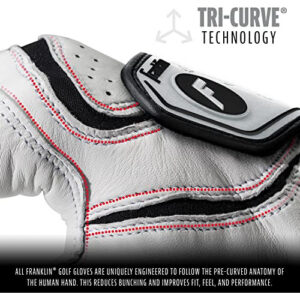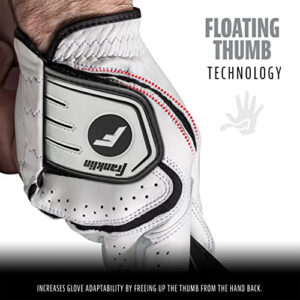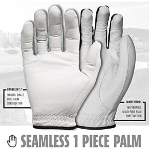 Franklin Sports Pro Golf Gloves are the perfect addition to any golf bag to help perfect your swing with comfort and style. Made from genuine sheepskin Cabretta leather, these gloves are built for a responsive, comfortable feel while providing unmatched grip for premium performance. Perforations in the fingerbacks and knuckles make these gloves breathable, while the one-piece palm construction reduces bunching and blisters so your hands can be cool and comfortable all day long. Plus, the 100% leather construction ensures that these gloves are built to last, so no matter how many swings you take, these gloves will be up to the test year after year. So if youre ready to take your golf game to the next level, grab yourself a Franklin Sports Pro Golf Glove and hit the links today!