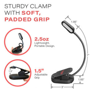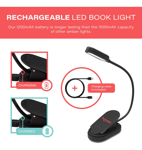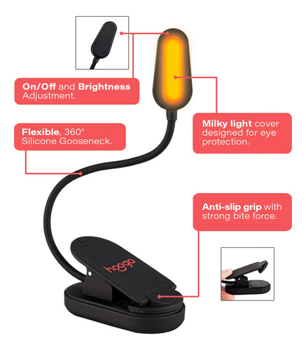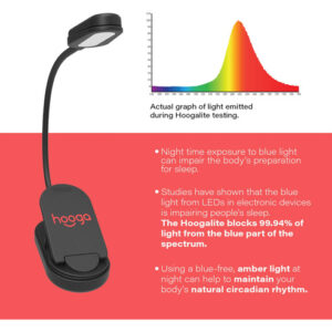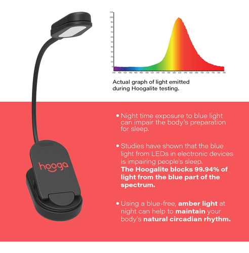 The book light is a non-blue light emitting clip-on reading light that emits only a sleep friendly, amber hue which reduces eye strain and helps the body maintain a natural circadian rhythm. Before the days of smartphones, LED TVs, and bright fluorescent lighting, our ancestors would spend their evenings reading and socializing over firelight or candlelight. Amber light such as candle light contains extremely low levels of blue spectrum light. The problem with blue spectrum light is that it is especially effective at signaling the body to wake up, be alert, and stay awake. In the evenings, particularly after the sun sets, we need to limit our exposure to blue light. The Hoogalite emits only 0.06% of its light from the blue light spectrum, encouraging the bodys natural secretion of melatonin to promote a more restful, deep night of sleep like our ancestors used to experience. With a 1200mAh lithium ion rechargeable battery, youll have up to 30 hours of sleep friendly, amber hue light to enjoy on a single charge. Dont be fooled by other reading lights boasting longer battery life, either, as those exaggerated times are based on 10% power settings. The Hoogalite offers three power settings, 100%, 75% and 50%. A flexible, 7-inch gooseneck allows you to customize your lighting experience and cast a gentle, amber hue in any direction you please. This can be especially useful when reading in bed with a partner, so as to not disturb them while they sleep. The Hoogalite weighs just 2.5 ounces and can be rolled up and packed conveniently into a purse, briefcase or travel bag for use on the go. So grab a book, turn down the overhead lights, clip on the Hoogalite and rest assured that youre doing your circadian rhythm, your sleep, and your overall health a huge favor! – CIRCADIAN RHYTHM, LIGHT & SLEEP: Our amber, 1600K color temperature book light emits a warm, gentle light similar to fire or candle light that is 99.94% free of blue spectrum light. At nighttime, it is important to limit our exposure to bright white light to allow for the production of melatonin which allows us to fall asleep faster and get a more restful, restorative night of sleep. Our light is perfect for reading at night without disrupting your circadian rhythm. – LIGHT WEIGHT & TRAVEL FRIENDLY: Our blue blocking, amber book light is not only sleep friendly but also travel friendly as it is lightweight and portable. It weighs only 2.5oz, making it hardly noticeable when attached to a book or e-Reader, and features a strong, sturdy grip to ensure the light stays where it is clipped. It easily fits in a bag, purse, or briefcase and is perfect for reading on planes, in bed, in the car, camping and more! – READING IN BED AT NIGHT: Our book light allows you to read in bed at night without disturbing your sleep, your babies sleep or your partners sleep. The reading light features a flexible, 360 degree gooseneck which allows you to create the perfect reading space and position the light exactly where you want to. Our light is also great for getting up in the night to tend to children or babies without disrupting their sleep cycles. 3 brightness levels allow for a customized lighting experience! – EXTRA LONG BATTERY LIFE: Our book light comes equipped with an industry leading 1200mAH lithium battery, which is the largest among all clip on reading lamps on the market. You can forget about buying batteries and replacing them all the time with our book light, since all you need to do is plug it in and recharge it. It features an extra long battery life and comes with an included 3 foot micro-USB cable! – US COMPANY & CUSTOMER SERVICE : Hooga is a small business located in the United States with friendly and helpful customer service that is here to assist you in the event that anything goes wrong with your purchase or you have any questions. Please contact us directly if you need anything at all, and dont forget you have a 30 day return window if you arent satisfied.