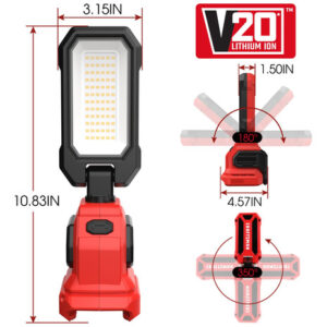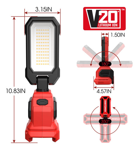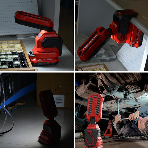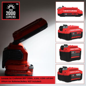 Luz de trabalho LED recarregável CRAFTSMAN V20 6500K, 2 configurações de brilho de 2000 LM e 1000 LM, gancho e braçadeira para várias opções de montagem, sem fio, somente para ferramentas – [Compatibilidade com bateria]: esta luz de trabalho LED sem fio (somente ferramentas) é compatível com toda a série de baterias Craftsman de 20 V, oferecendo baterias de íon de lítio de 2,0 Ah, 4,0 Ah, 6,0 Ah ou 9,0 Ah (Bateria (NÃO incluída) – [Brilho ajustável]: com duas configurações de brilho, você pode escolher entre alto brilho a 2000 lúmens para máxima visibilidade ou baixo brilho a 1000 lúmens para prolongar o tempo de execução – [ [Opções de montagem versáteis]: Equipado com gancho e braçadeira incorporados. Esta luz de trabalho recarregável é perfeita para uma ampla gama de aplicações, incluindo tarefas de construção, reparo automotivo e reforma doméstica – [Dissipação rápida de calor]: construída com materiais duráveis de PC e ABS, aletas ranhuradas de grandes dimensões para eliminação rápida de calor, evitando superaquecimento e garantindo uma vida útil mais longa – [Observe o seguinte]: 1. Nenhuma bateria incluída, apenas a ferramenta. 2. Remova a bateria quando não estiver em uso para evitar o consumo de energia