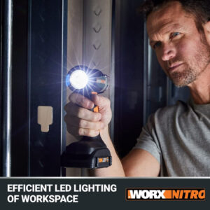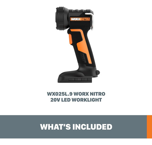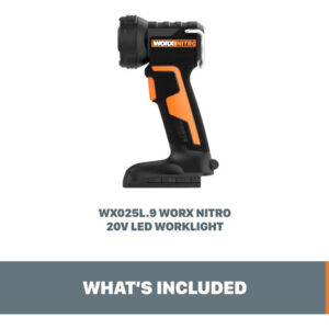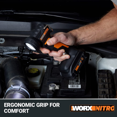 Luz de trabalho LED WORX Nitro 20V PowerShare, luz portátil de 160/350 lúmens, lanterna LED com cabeça giratória flexível WX025L.9 Somente ferramenta – VISIBILIDADE APRIMORADA: não se contente com lanternas recarregáveis que não são brilhantes o suficiente. Esta luz de trabalho oferece configurações duplas para produzir 160/350 lúmens de iluminação LED brilhante, duradoura e eficiente, para que você possa ver claramente com confiança – POTÊNCIA PORTÁTIL: enquanto outras luzes alimentadas por bateria podem ser desajeitadas e pesadas, esta luz de trabalho leve e elegante é altamente portátil para uso fácil em qualquer lugar – CABEÇA AJUSTÁVEL: A cabeça da luz de trabalho gira de -5 a 90 para máxima versatilidade – MESMA BATERIA, POTÊNCIA EXPANSÍVEL: a mesma bateria PowerShare (vendida separadamente) que aciona essa luz recarregável pode ser usada convenientemente com mais de 140 ferramentas elétricas, ao ar livre equipamentos elétricos e produtos de estilo de vida da plataforma Worx PowerShare – ILUMINAÇÃO SEM USAR AS MÃOS: solte as mãos e pendure esta lanterna recarregável com o gancho integrado ou coloque-a em sua base robusta para posicioná-la para otimizar a visibilidade – ALÇA CONFORTÁVEL: segurar essas luzes da bateria nunca é difícil com a alça GRIPZONE, com uma microtextura que permite uma aderência segura e confortável – INCLUI: Luz de trabalho LED sem fio de 20V