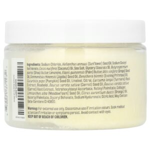 Cloreto de sódio, óleo da semente de Helianthus annuus (girassol), sodium cocoyl isethionate, óleo de Cocos nucifera (coco), sal marinho, monoestearato de glicerila autoemulsionável, manteiga de Butyrospermum parkii (karité), limoneno, manteiga de Elaeis guineensis (palma), óleo da semente de Vitis vinifera (uva), óleo da semente de Simmondsia chinensis (jojoba), óleo de Oenothera biennis (prímula), óleo da semente de Cucurbita pepo (abóbora), linalol, citral, extrato da raiz de Curcuma longa (cúrcuma), bisabolol, óleo da semente de Daucus carota sativa (cenoura), extrato da raiz de Daucus carota sativa (cenoura), tetrahexidecil ascorbato, palmitato de retinol, colágeno, óleo da semente de Limnanthes alba (meadowfoam), óleo de Citrus aurantium dulcis (laranja), palmitato de ascorbila, beenato de glicerila, hialuronato de sódio, ácido cítrico, Pode conter: betacaroteno (CI 40800).