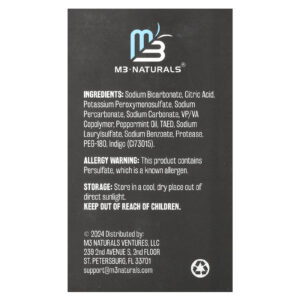 Bicarbonato de sódio, ácido cítrico, peroximonossulfato de potássio, percarbonato de sódio, carbonato de sódio, copolímero vp/va, óleo de hortelã-pimenta, taed, laurilsulfato de sódio, benzoato de sódio, protéase, peg-180, índigo (CI73015).