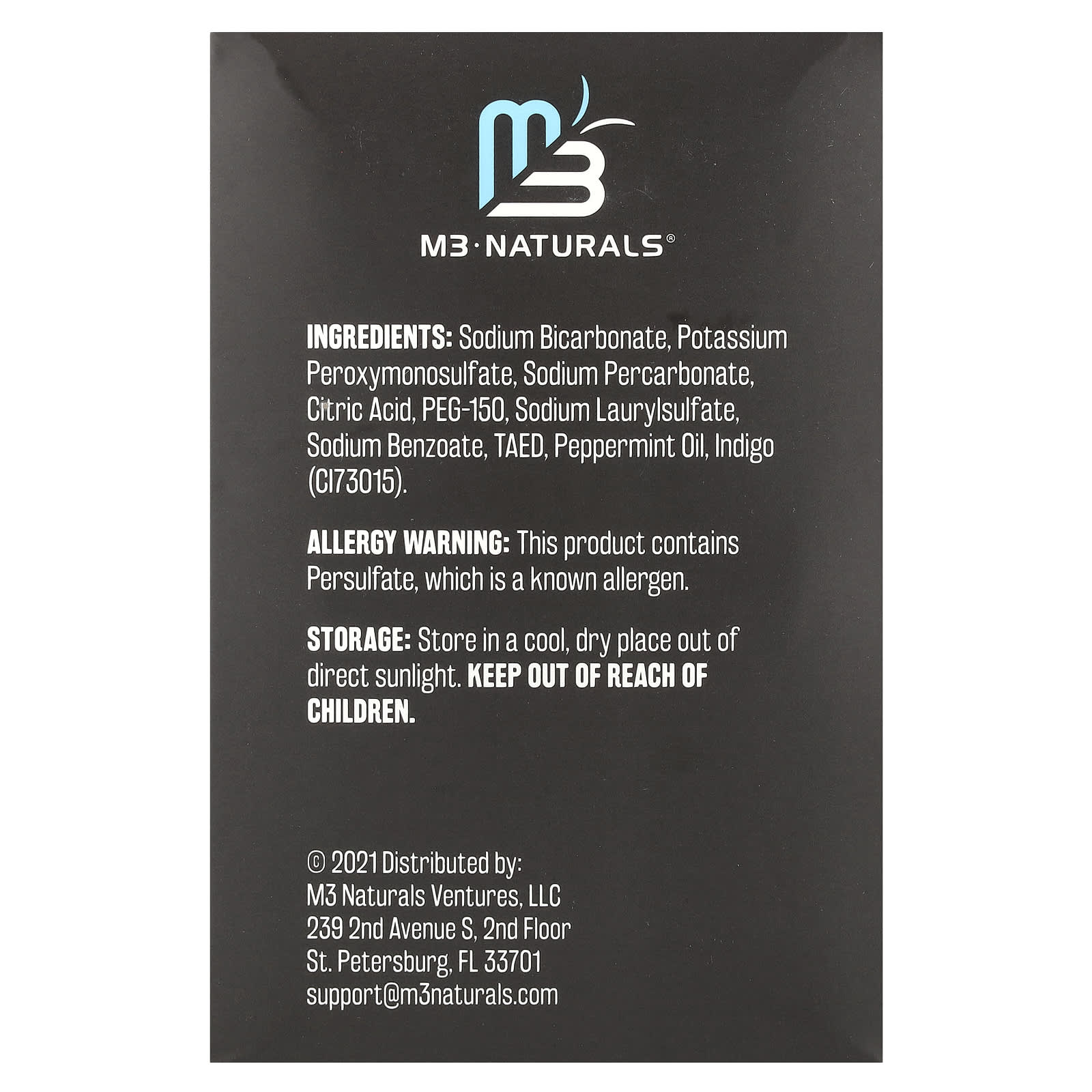 Bicarbonato de sódio, peroxi monosulfato de potássio, percarbonato de sódio, ácido cítrico, peg-150, laurilsulfato de sódio, benzoato de sódio, TAED, óleo de hortelã-pimenta, índigo (CI73015).