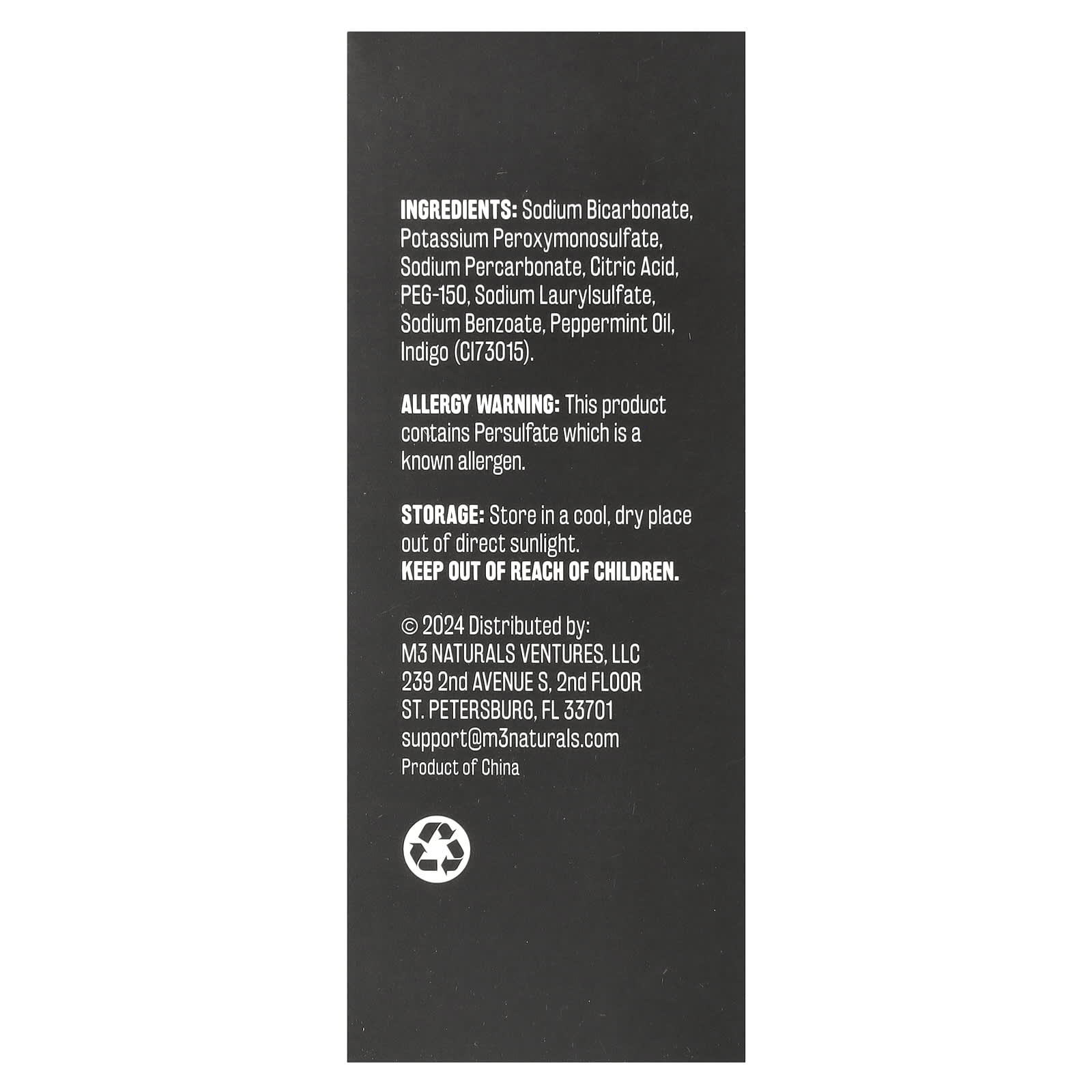 Bicarbonato de sódio, peroximonossulfato de potássio, percarbonato de sódio, ácido cítrico, peg-150, laurilsulfato de sódio, benzoato de sódio, óleo de hortelã-pimenta, índigo (CI73015).