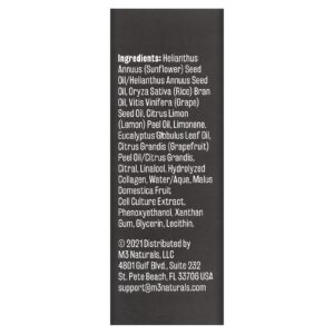 Óleo da semente de Helianthus annuus (girassol) / óleo da semente de Helianthus annuus, óleo de farelo de Oryza sativa (arroz), óleo da semente de Vitis vinifera (uva), óleo da casca de Citrus limon (limão-siciliano), limoneno, óleo da folha de Eucalipto globulus, óleo da casca de Citrus grandis (toranja) / Citrus grandis, citral, linalol, colágeno hidrolisado, água, extrato de cultura de células de malus domestica, fenoxietanol, goma xantana, glicerina, lecitina.
