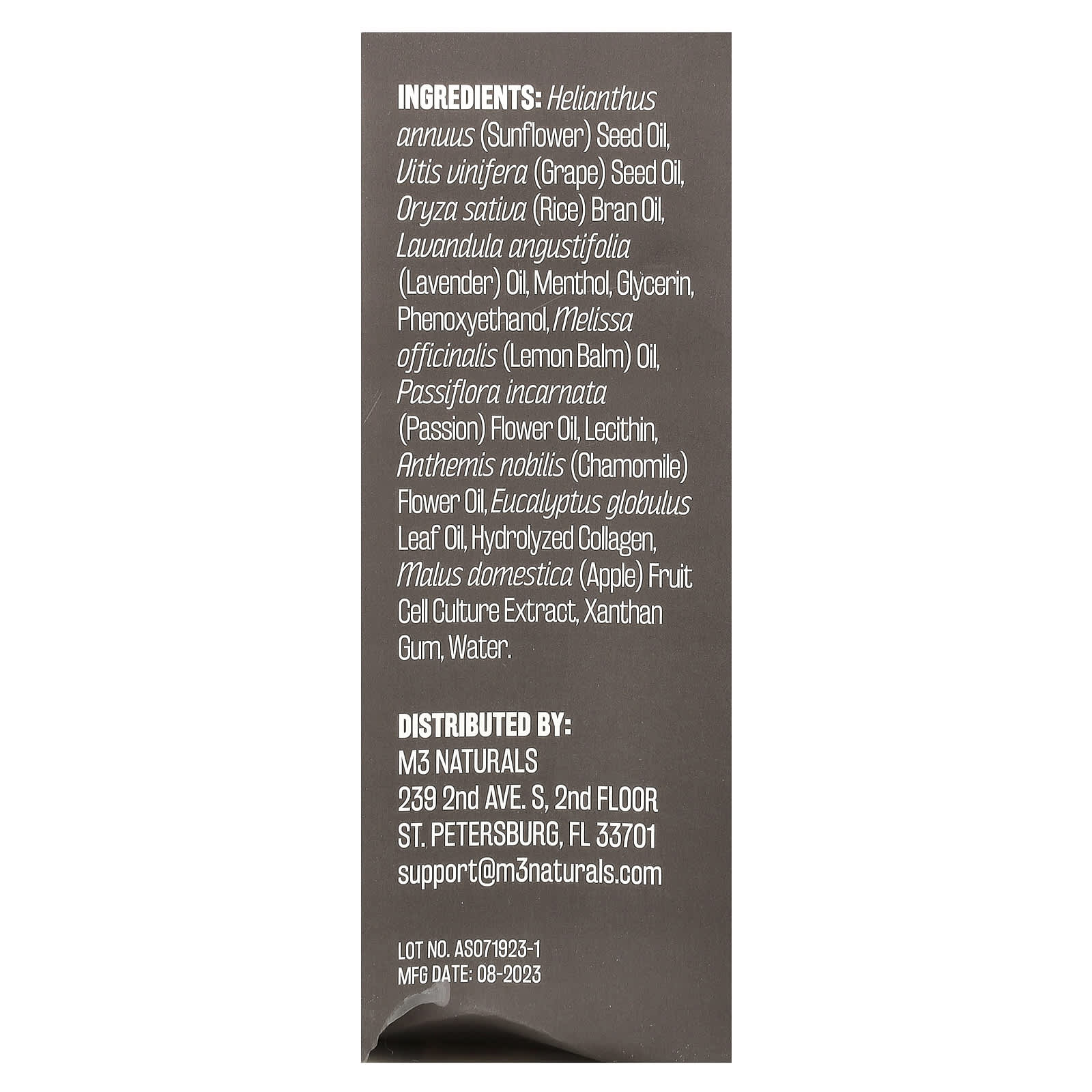 Óleo da semente de Helianthus annuus (girassol), óleo da semente de Vitis vinifera (uva), óleo do farelo de Oryza sativa (arroz), óleo de Lavandula angustifolia (lavanda), mentol, glicerina, fenoxietanol, óleo de Melissa officinalis (erva-cidreira), óleo da flor de maracujá de Passiflora incarnata, lecitina, óleo da flor de Anthemis nobilis (camomila), óleo da folha de Eucalypto globulus, colágeno hidrolisado, extrato da cultura de células da fruta de Malus domestica (maçã), goma xantana, água.