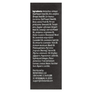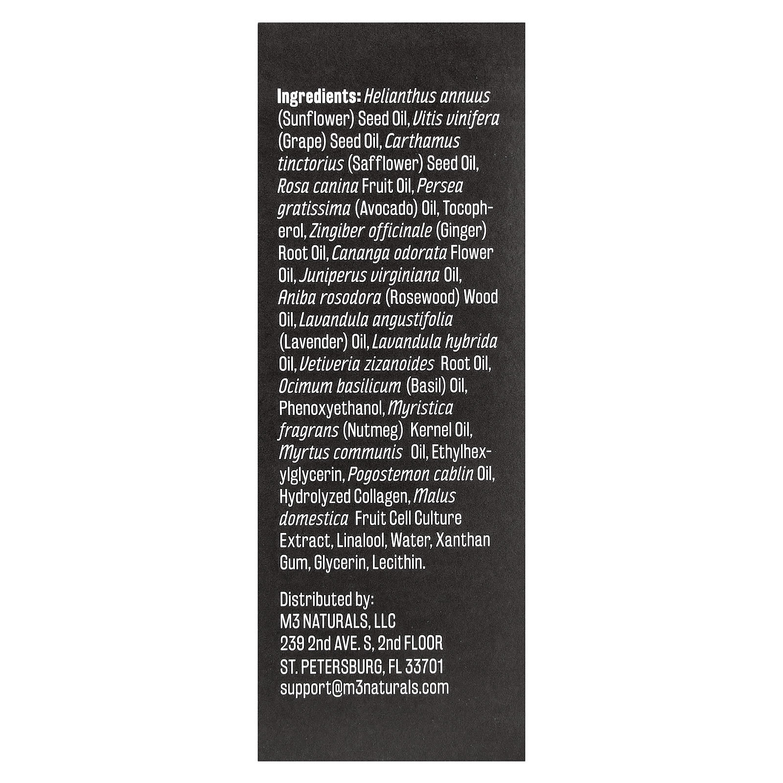 Óleo da semente de Helianthus annuus (girassol). óleo da semente de vitis vinifera (uva), óleo da semente de Carthamus tinctorius (cártamo), óleo da fruta de Rosa canina, óleo de Persea gratissima (abacate), tocoferol, óleo da raiz de Zingiber officinale (gengibre), óleo da flor de Cananga odorata, óleo de Juniperus virginiana, óleo da madeira de Aniba rosodora (pau-rosa), óleo de Lavandula angustifolia (lavanda), óleo de Lavandula hybrida, óleo da raiz de Vetiveria zizanoides, óleo de ocimum basilicum (manjericão), fenoxietanol, óleo de semente de myristica fragrans (noz-moscada), óleo de Myrtus communis, ethylhexylglycerin, óleo de Pogostemon cablin, colágeno hidrolisado, extrato da cultura de células da fruta Malus domestica, linalol, água, goma xantana, glicerina, lecitina.