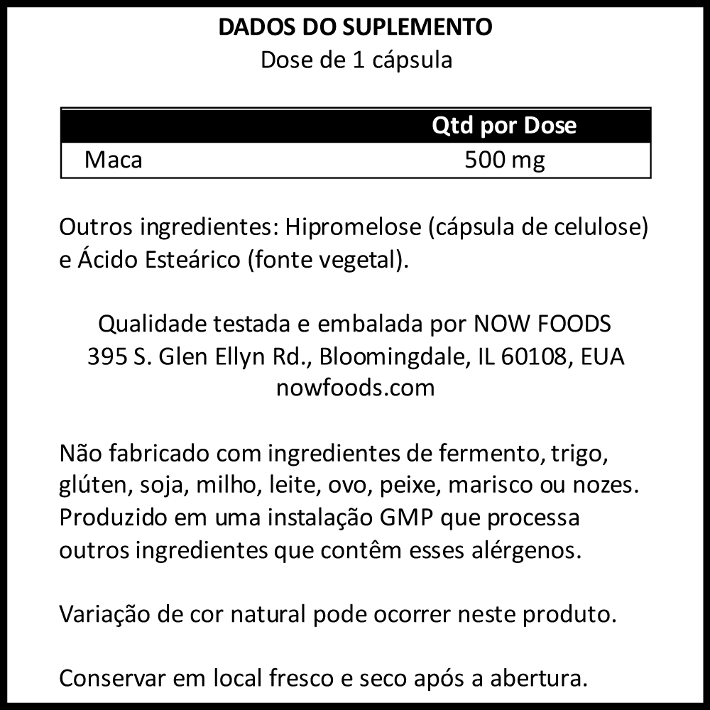 Kit Maca Peruana 500mg Now Foods 250 Caps + Porta Cápsulas Energia e Vitalidade: A Maca Peruana é amplamente reconhecida por seu papel em promover energia e vitalidade. Este suplemento é uma excelente escolha para quem busca um impulso natural no dia a dia. Cápsulas Vegetarianas Convenientes: Apresentado em um frasco com 250 cápsulas vegetarianas, este suplemento oferece uma forma prática e respeitosa com o meio ambiente de consumir Maca Peruana. Cada cápsula de 500mg facilita a manutenção de uma rotina consistente. Qualidade Internacional e Pronta Entrega: Importado para garantir a mais alta qualidade, este produto está disponível para pronta entrega. Sua disponibilidade imediata permite que você incorpore os Destaques da Maca Peruana em sua rotina sem demora. Porta Cápsulas com Duas Repartições: O kit também inclui um porta-cápsulas prático, dividido em duas seções internas. Isso permite uma organização eficaz e separada de diferentes tipos de cápsulas ou pílulas. Destaques da Composição da Maca Peruana: A Maca Peruana é conhecida por suas propriedades nutricionais naturais. Cada cápsula contém 500mg deste poderoso superalimento, oferecendo um suporte efetivo para quem busca uma fonte natural de vitalidade. VALIDADE LONGA