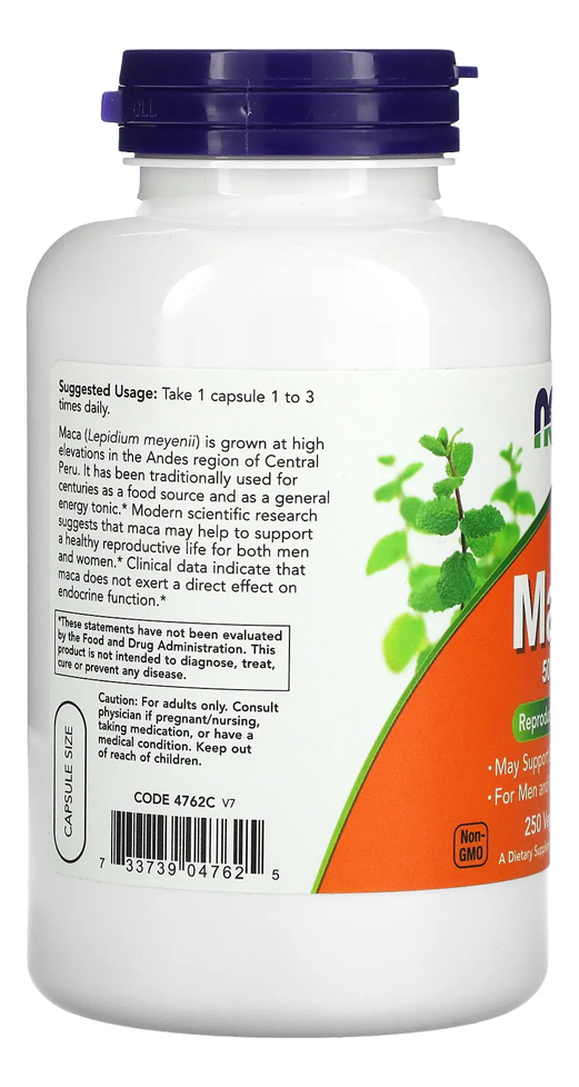 Maca Peruana 500mg Now Foods 250 veg caps pode apoiar o bem-estar sexual para homens e mulheres. É tradicionalmente usada há séculos como fonte de alimento e tônico energético geral. Pode ajudar a manter uma vida reprodutiva. Outros ingredientes: Hipromelose (cápsula de celulose) e ácido esteárico (fonte vegetal). Não contém fermento, trigo, glúten, soja, milho, leite, ovo, peixe, marisco ou ingredientes de nozes. Produzido em uma instalação de GMP que processa outros ingredientes contendo esses alérgenos. Apenas para adultos. Consulte um profissional se estiver grávida / amamentando, tomando medicamentos ou se tiver um problema de saúde.