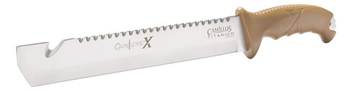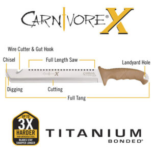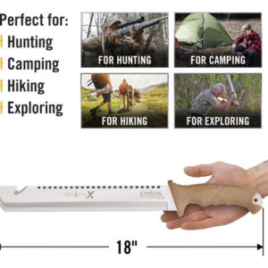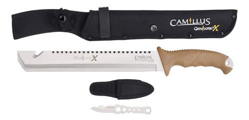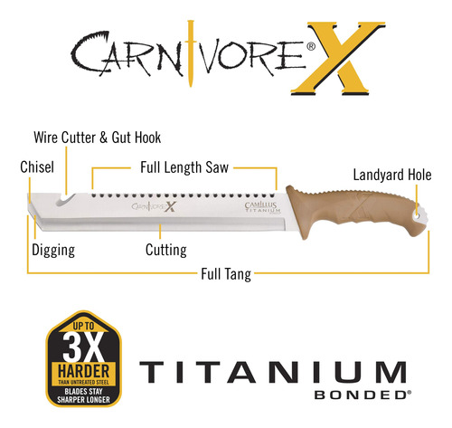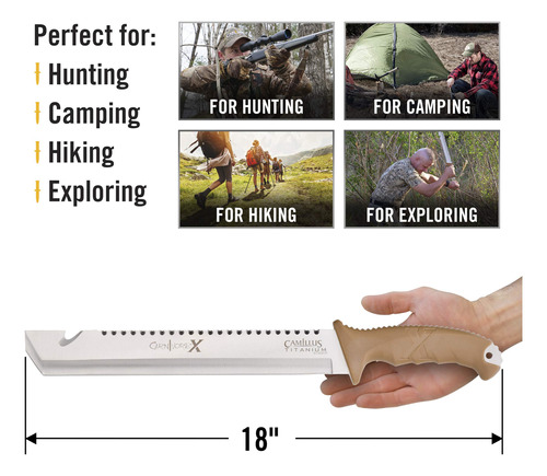 Facão durável Camillus Carnivore X 18" em aço inoxidável 420 colado com titânio, caça, caminhada, acampamento e sobrevivência com capa de nylon e faca removível — Design multiuso — O facão Camillus CARNIVORE X 18" foi projetado para uma variedade de tarefas, incluindo cortar, cavar, serrar, cinzelar e eviscerar com eficiência incomparável; seu design versátil o torna uma ferramenta confiável para várias atividades ao ar livre – DURÁVEL LÂMINA – A lâmina de 12" deste facão de caça apresenta tratamento de colagem de titânio, tornando-a até 3 vezes mais dura do que o aço não tratado; esta garante durabilidade e retenção de bordas excepcionais, mesmo após uso prolongado em ambientes hostis – FACA DE CORTE REMOVÍVEL – O facão de acampamento possui uma faca de corte removível com sua capa de náilon dedicada; isso fornece funcionalidade adicional para tarefas de corte precisas e uso diário, garantindo que você possa enfrentar uma variedade de desafios de corte com facilidade – BAINHA PROTETORA – O CARNIVORE X vem completo com uma capa robusta de nylon balístico; isso facilita a portabilidade sem complicações durante aventuras ao ar livre e garante seu facão de caminhada permanece acessível e bem protegido onde quer que suas atividades ao ar livre o levem – COMPANHEIRO VERSÁTIL – Seja caçando, acampando, caminhando ou explorando, o facão Camillus é adequado para uma variedade de atividades ao ar livre; sua construção robusta e design abrangente o tornam uma ferramenta indispensável para entusiastas e sobreviventes de atividades ao ar livre