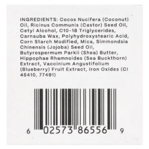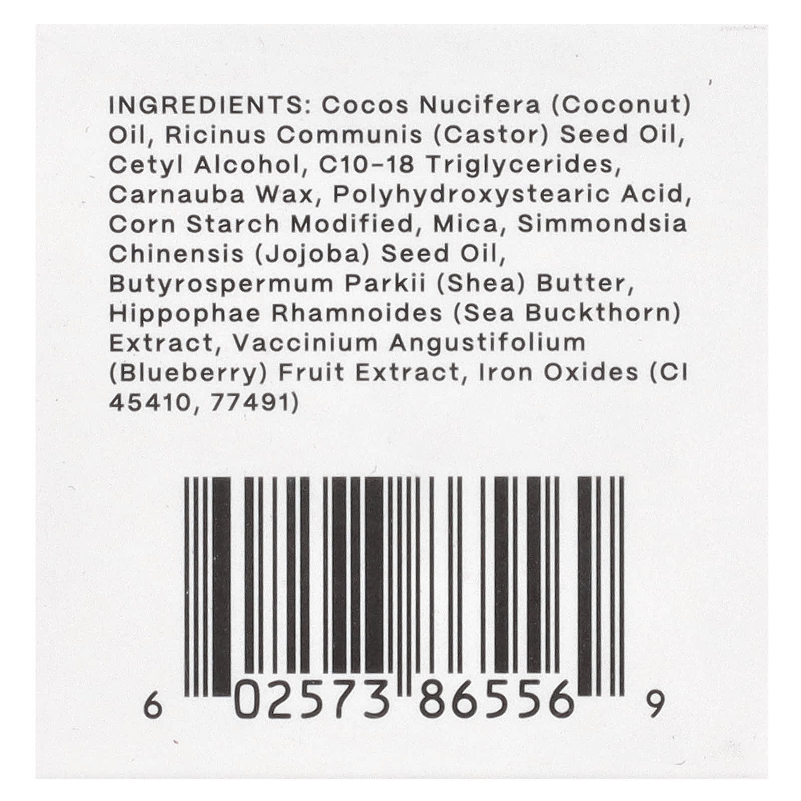 Óleo de Cocos nucifera (coco), óleo da semente de Ricinus communis (rícino), álcool cetílico, triglicerídeos c10-18, cera de carnaúba, ácido polihidroxiesteárico, amido de milho modificado, mica, óleo da semente de Simmondsia chinensis (jojoba), manteiga de Butyrospermum parkii (karité), extrato de Hippophae rhamnoides (espinheiro marítimo), extrato da fruta Vaccinium angustifolium (mirtilo), óxidos de ferro (CI 45410,77491).