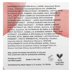 Água deionizada (aqua), disodium cocoamphodiacetate, extrato do caule de Bambusa arundinacea (bambu), ácido láctico, ácido glicólico, pedra-pomes (cinza vulcânica), ácido mandélico, complexo de ácidos de frutas (extrato da fruta de Vaccinium myrtillus, extrato de Saccharum officinarum [cana-de-açúcar], extrato de Acer saccharum [bordo-açucareiro], extrato da fruta de Citrus aurantium dulcis [laranja], extrato da fruta de Citrus limon [limão] [ácido da fruta dl]), ácido mirístico, álcool cetílico, glicerina, extrato da raiz de Glycyrrhiza glabra (alcaçuz), extrato da folha de Camellia sinensis (chá verde), extrato da flor de Calendula officinalis, ácido esteárico, esqualano (vegano), lisado do fermento de Lactococcus (probiótico), álcool fenetílico, caprylyl glycol, ethylhexyl glycerin, ácido de hialuronato de sódio (ácido hialurônico), óleo da casca de Citrus aurantium dulcis (laranja) destilado a vapor, óleo de Citrus aurantifolia (limão) destilado a vapor.