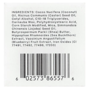 Óleo de Cocos nucifera (coco), óleo da semente de Ricinus communis (rícino), álcool cetílico, triglicerídeos c10-18, cera de carnaúba, ácido polihidroxiesteárico, amido de milho modificado, mica, óleo da semente de Simmondsia chinensis (jojoba), manteiga de Butyrospermum parkii (karité), extrato de Hippophae rhamnoides (espinheiro marítimo), extrato da fruta de Vaccinium angustifolium (mirtilo), óxidos de ferro (77491,77492,77499,17200).