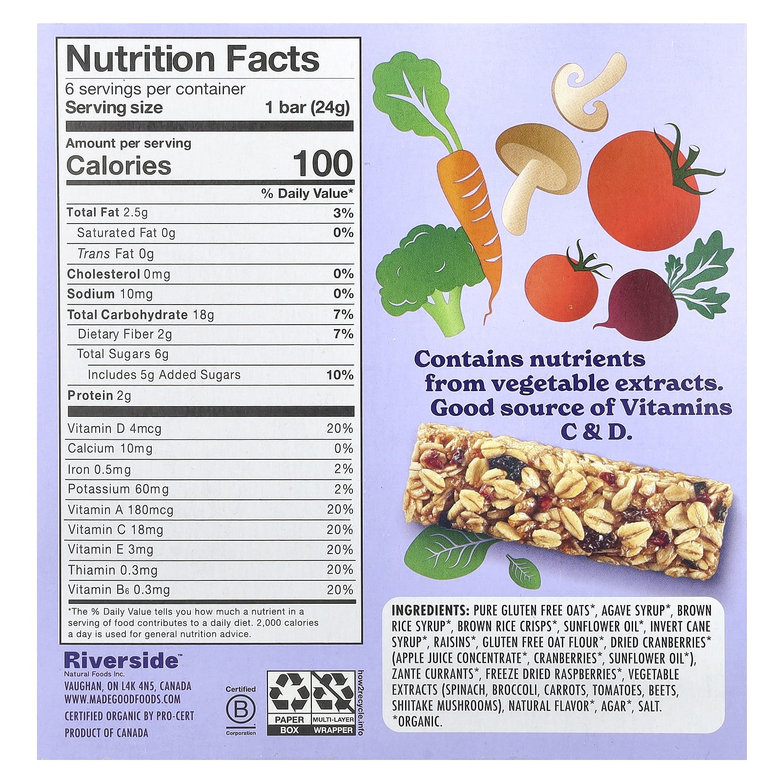 Aveia pura sem glúten*, xarope de agave*, xarope de arroz integral*, crocantes de arroz integral*, óleo de girassol*, xarope de cana invertido*, passas*, farinha de aveia sem glúten*, cranberries desidratadas* (concentrado de suco de maçã*, cranberries*, óleo de girassol*), groselha zante*, framboesas liofilizadas*, extratos vegetais (espinafre, brócolis, cenouras, tomates, beterraba, cogumelos shiitake), sabor natural*, agar*, sal.