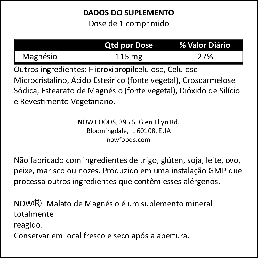 Now Foods Magnésio Dimalato Malate 1000mg 180 Tablets / No Brasil