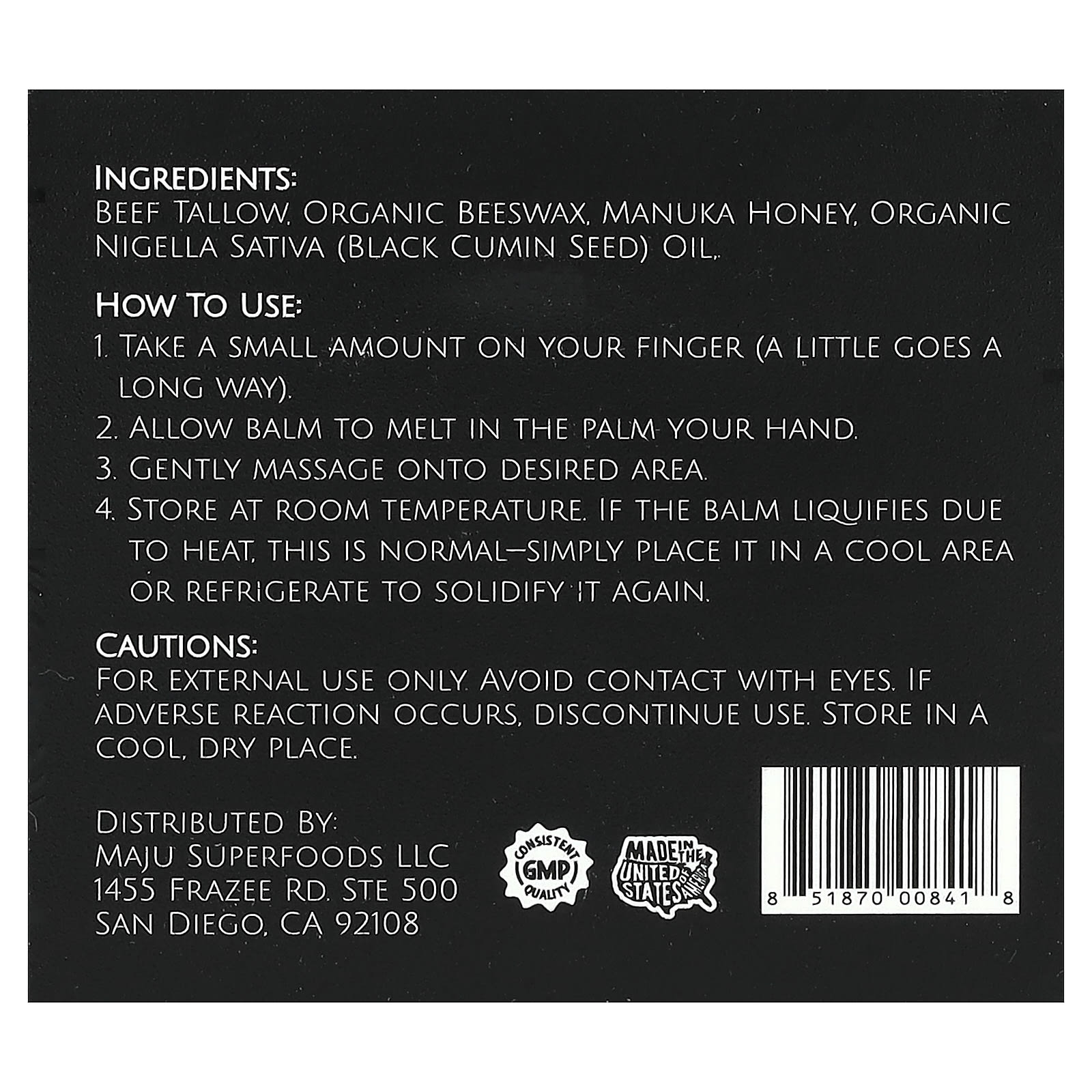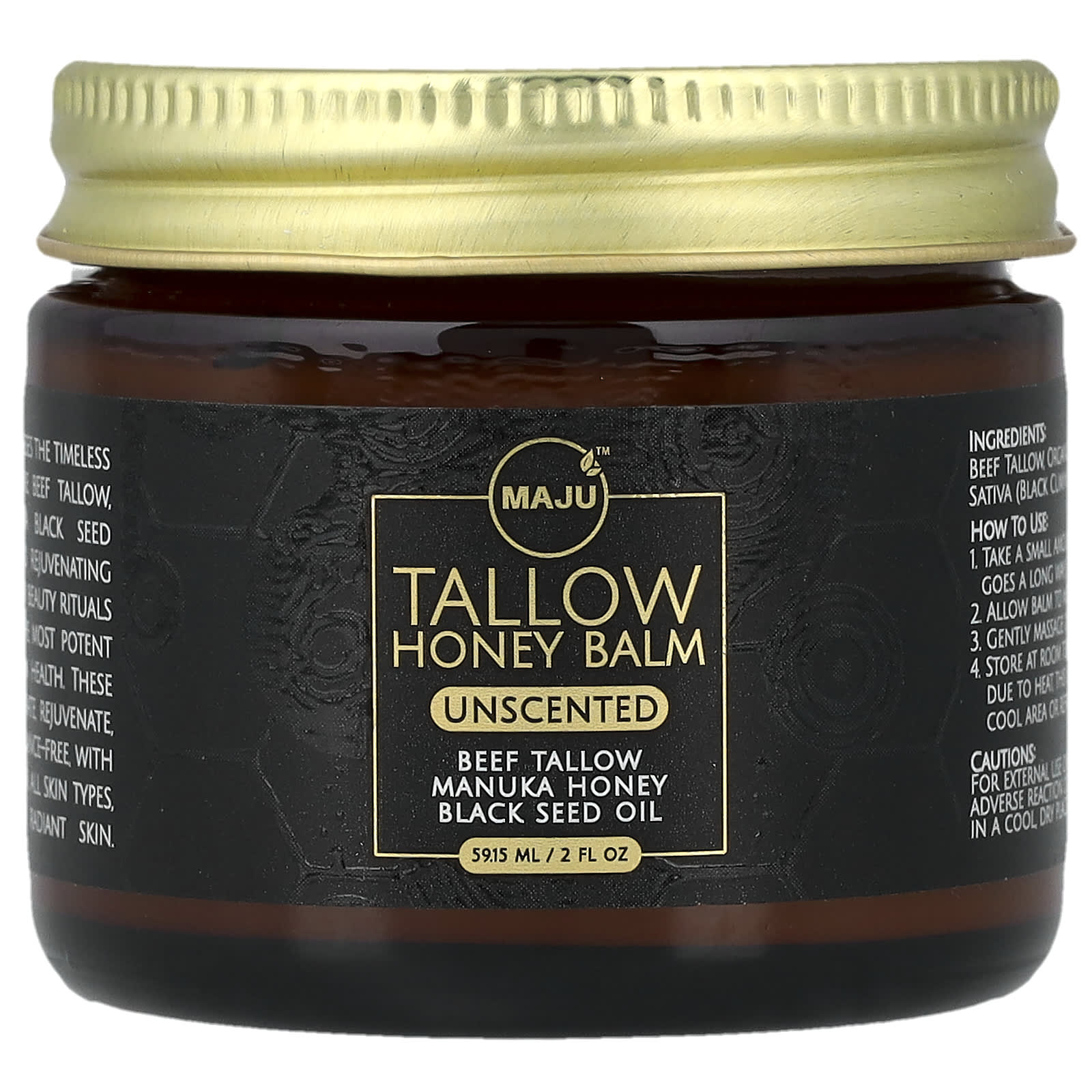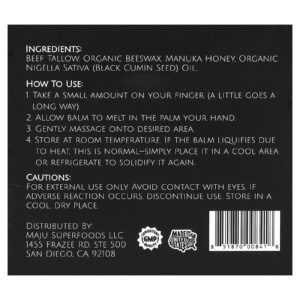 Sebo bovino. cera de abelha orgânica, mel de manuka, óleo de Nigella sativa orgânica (semente de cominho preto).