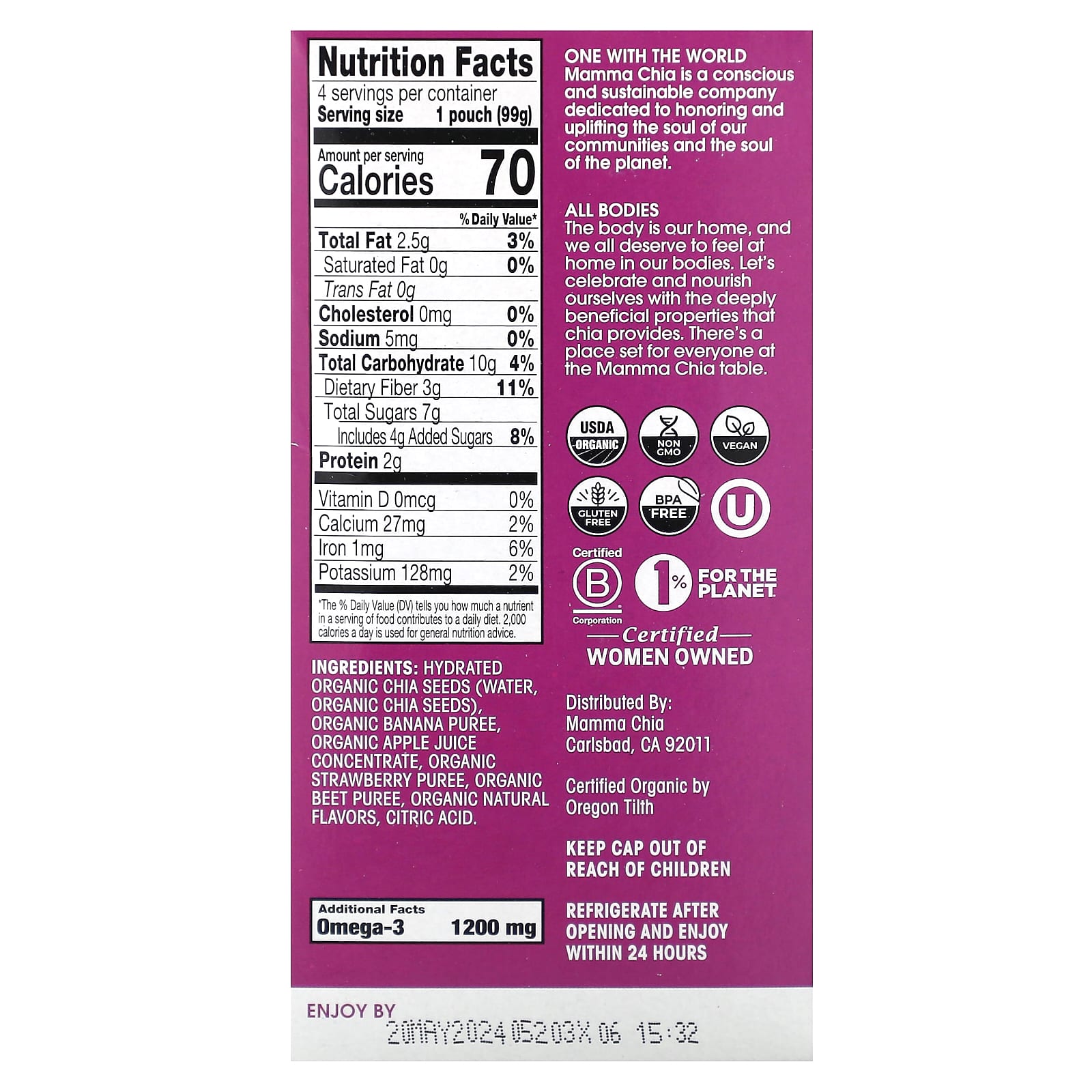 Proporcionar um pouco de vitalidade natural e nutrientes poderosos em seu dia. Nossas sementes de chia orgânica são infundidas com frutas e vegetais vibrantes para criar um lanche conveniente para almas de todas as idades. Com Ômega-3 à base de plantas e fibras prebióticas, o Squeeze de Chia é uma explosão saborosa que coloca o corpo, a mente e a alma em um maior equilíbrio.