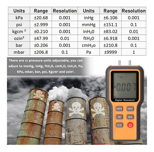 Existem 12 unidades de pressão ajustáveis, você pode ajustar a mmHg, inHg, Fth2O, cmH2O, InH2O, Pa, kPa, mbar, bar, psi, Kgcm2 e ozin2.