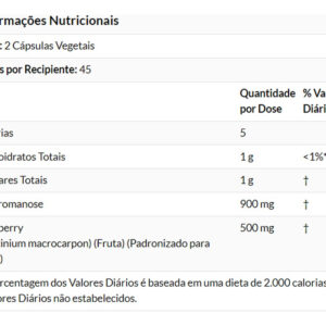 Outros Ingredientes: Hipromelose (cápsula de celulose), Dióxido de Silício e Ácido Esteárico (fonte vegetal). Não é fabricado com ingredientes de trigo, glúten, soja, leite, ovo, peixe, marisco ou nozes;