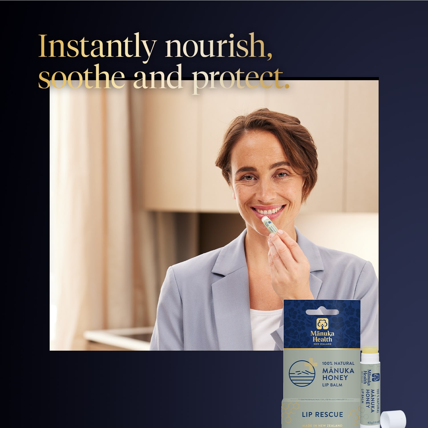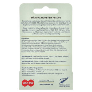 Nutra e proteja os seus lábios com este bálsamo natural suave, mas intensivo. Puro MGO 250+ Mel de Manuka, cera de abelha e flor de calêndula reabastecem profundamente os lábios secos e ásperos, deixando-os macios e suaves.