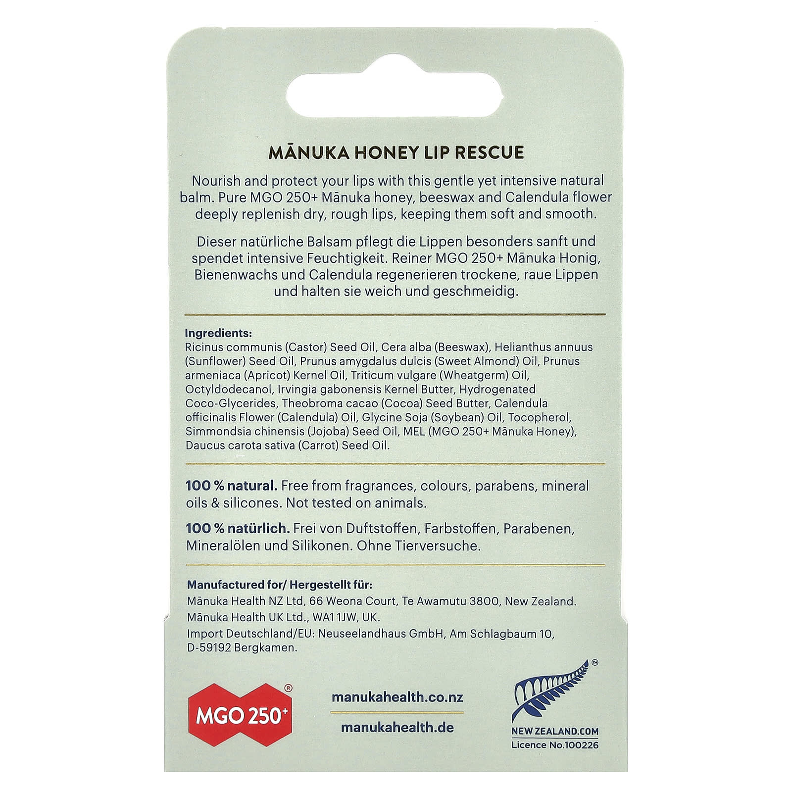 Óleo da semente de Ricinus communis (rícino), cera alba (cera de abelha), óleo da semente de Helianthus annuus (girassol), óleo de Prunus amygdalus dulcis (amêndoa doce), óleo da semente de Prunus armeniaca (damasco), óleo de triticum vulgare (gérmen de trigo), octildodecanol, manteiga de grão de Irvingia gabonensis, glicerídeo de coco hidrogenado, manteiga da semente de Theobroma cacao (cacau), óleo da flor de Calêndula officinalis (calêndula), óleo de Glycine soja (soja), tocoferol, óleo da semente de Simmondsia chinensis (jojoba), mel (mgo 250+ mel manuka), óleo da semente de Daucus carota sativa (cenoura).