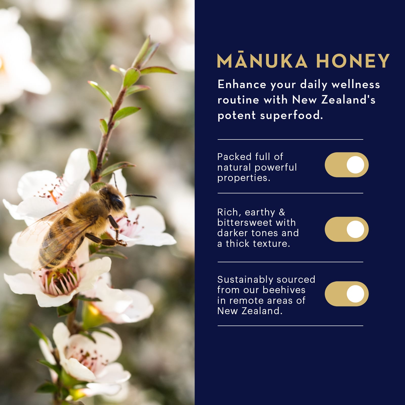 Feito com nosso Mel de Manuka MGO 400+ de alto qualidade, certificado por seu conteúdo natural de metilglioxal (400 mg/kg).