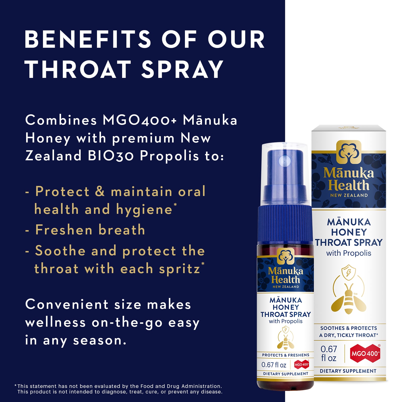 O Spray para Garganta de Mel de Manuka protege e reforça a saúde e a higiene bucal durante todas as estações do ano.