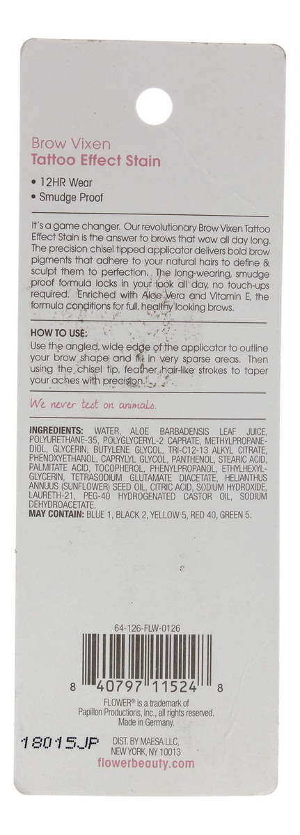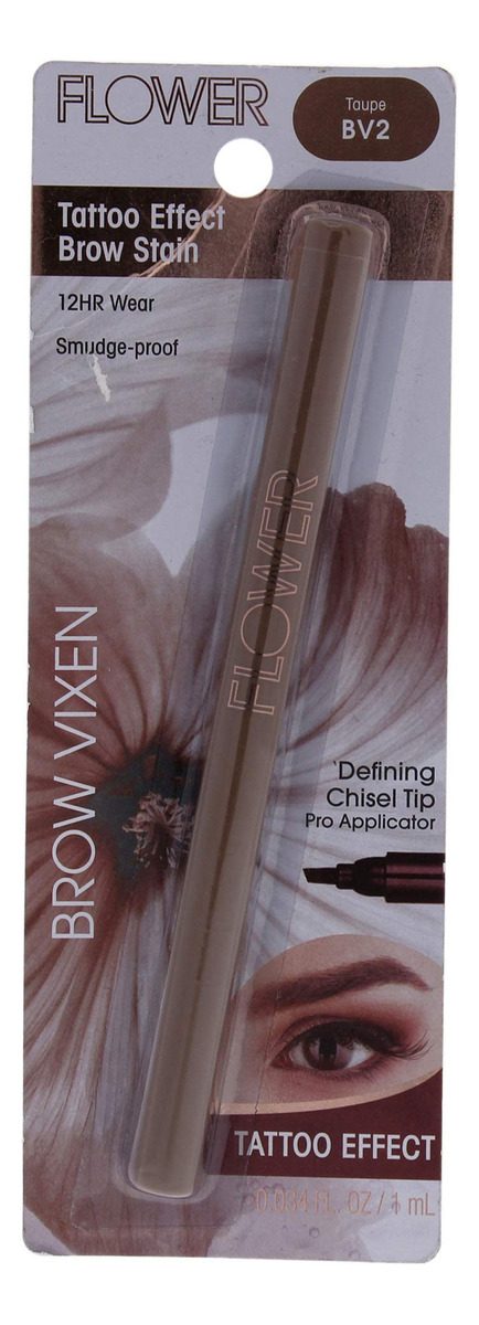 A maquiagem de sobrancelha Flower Beauty Brow Vixen Tattoo Effect Stain Smudge Proof 12 horas de uso com aplicador com ponta de cinzel contém aloe vera e vitamina E, cinza, 0,034 onças