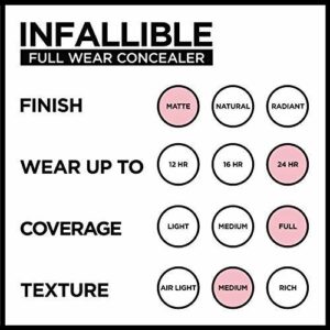 Be Unstoppable. Experience full-on coverage and full-face wear for up to 24 hours. New Full Wear Concealer is our highest coverage formula in our widest concealer shade range ever. LOreal Paris Full Wear Concealer provides full coverage with a flawless matte finish. This multi-use formula conceals imperfections while doubling as a contour/highlight product. Shape your face by going 1 to 2 shades deeper to contour and 1 to 2 shades lighter to highlight and brighten. Our extra-large applicator provides maximum coverage in 1 stroke to cover under-eye circles, acne scars, and discoloration. Our waterproof, non-greasy formula wont transfer, fade, or flake so your full coverage look is locked in all day. A little goes a long way. Available in 25 full coverage shades for every skin t1.