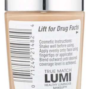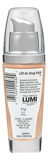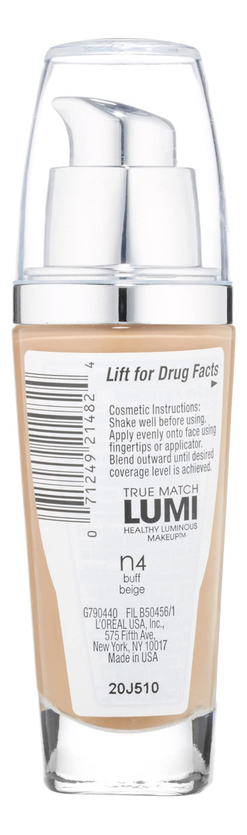Maquiagem luminosa saudável L'Oreal Paris True Match Lumi, N4 Buff Beige, 1 fl; oz. — A base luminosa com SPF combina ingredientes poderosos para melhorar sua tez quanto mais você os usa; 40% de água para hidratação; vitaminas C e E para melhorar a clareza e o tom da pele e tecnologia de luz líquida para um brilho instantâneo — Maquiagem facial True Match Lumi: cada base e iluminador True Match Lumi oferecem tons que podem embelezar qualquer tom e subtom de pele, para uma cobertura brilhante e luminosidade instantânea – A base do seu look: dos cremes BB ao blush, L'Oral A maquiagem facial tem tudo o que você precisa; destaque para iluminar sua aparência, use corretivo para esconder imperfeições ou aplique maquiagem de contorno para obter traços aprimorados e definidos – Porque você vale a pena: a L'Oral Paris ajuda você a criar a aparência desejada com nossa linha completa de maquiagem, incluindo bases, corretivos, maquiagem iluminadora, paletas de sombras, batons e muito mais – Perfeita para combinar com o corretivo True Match Super-Blendable, que combina com precisão o tom e a textura da sua pele e combina perfeitamente com maquiagem, pó e blush True Match