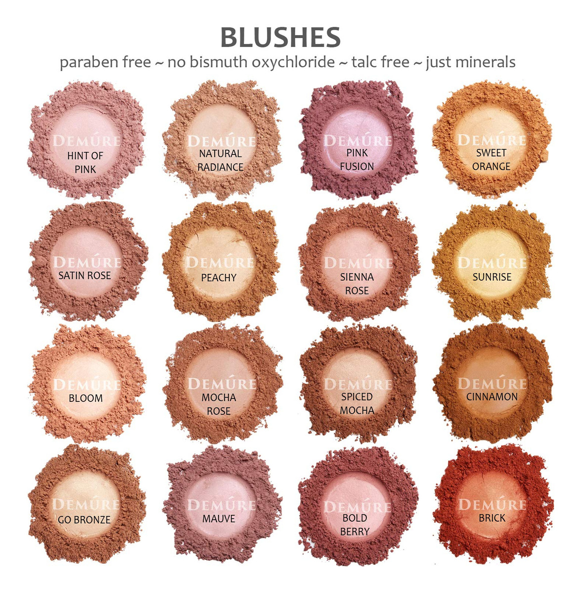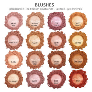 A maquiagem mineral Demure é feita com minerais 100% puros triturados da terra e não contém enchimentos, talco ou oxicloreto de bismuto. Sem produtos químicos, conservantes nocivos ou outros irritantes para a pele. Não testado em animais e sem partículas micronizadas ou nanopartículas. Nossos minerais puros se misturam bem e são altamente pigmentados. Funciona bem em todos os tipos de pele e oferece excelente cobertura mesclável. As cores do blush podem ser misturadas com brilho labial transparente ou até esmalte para criar seus próprios tons personalizados. – A paleta Mineral Blush da Demure inclui 12 tons feitos de todos os minerais naturais. Fácil de aplicar e continua suave. Naturalmente resistente à água e deixa sua pele respirar. – Nossa maquiagem mineral é feita com minerais 100% puros triturados da terra. Sem produtos químicos, conservantes nocivos ou outros irritantes para a pele, como talco ou arroz. Livre de aditivos, sem aglutinantes, sem enchimentos e sem fragrância. – O Demure's Mineral Blush é leve, mas oferece ótimas cores. Altamente pigmentado. Aplique uma camada fina para um tom claro e camadas adicionais para cores médias ou fortes. Aplique de forma personalizada para criar a aparência desejada. – Ótimo para todos os tipos de pele. Pele sensível, pele oleosa, pele seca e pele madura. Não testado em animais. Livre de crueldade. Feito nos EUA. – LIVRE DE RISCOS. Experimente nosso Demure Mineral Blush sem nenhum risco. Se, por algum motivo, você não estiver satisfeito com seu pedido, entre em contato conosco dentro de 30 dias após a compra e substituiremos o produto ou enviaremos um reembolso.
