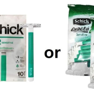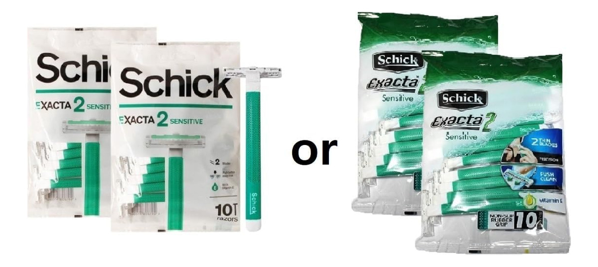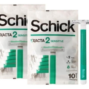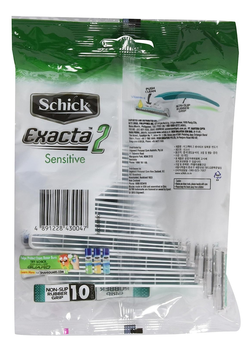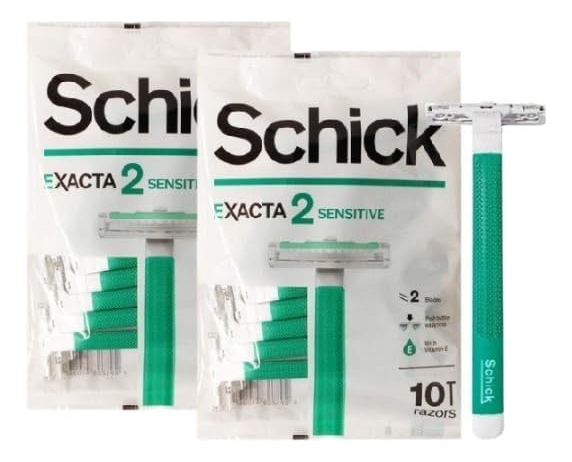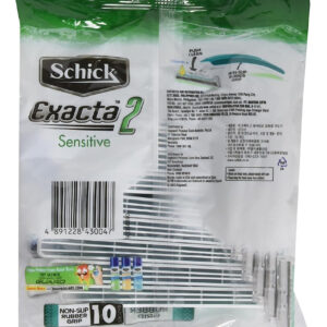 Contém o barbeador descartável Exacta2 Sensitive de vitamina E, 20p (10 unidades x 2 unidades) — Alça antiderrapante de borracha — 2 lâminas finas — Limpeza com um toque — Contém vitamina E para peles sensíveis — Design fácil de transportar — Faixa de lubrificação — Barbear suave