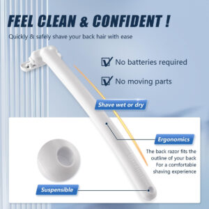 Barbeadores de costas Durimi para homens: o barbeador masculino DIY para homens com tecnologia Safety Blade e cabo ergonômico, barbear úmido ou seco — o barbeador masculino Durimi foi especialmente projetado para lâminas de barbear para costas e corpo que podem depilar rapidamente os pelos das costas e do corpo em questão de minutos. Este barbeador masculino deixará seu verão ainda mais feliz. – Mais rápido, seguro e suave: nossos barbeadores masculinos são feitos do melhor aço alemão e usam uma tecnologia patenteada exclusiva para o barbear mais simples e suave. Nossos aparadores de costas masculinos têm uma faixa antiderrapante exclusiva que pode ser suavizada com água. Escove as costas para remover os pelos sem causar dor. – Ergonômico: o barbeador masculino Durimi é fácil de segurar e ergonômico. O barbeador de costas masculino é o barbeador de costas perfeito, permitindo que os homens passem menos tempo no banheiro e mais tempo exibindo costas lisas. – Sem bateria: melhor do que um barbeador elétrico, o que significa que o barbeador traseiro para as costas e o corpo não precisa de baterias e partes móveis. Com o Durimi Men's Back Shaver, você sempre terá a capacidade de se manter destemido e mostrar melhor seu charme masculino na frente dos outros. – Embalagem e acessórios, após a venda: você receberá 3 lâminas de aço alemão, um cabo de faca e uma corda de mão. Se tiver alguma dúvida, entre em contato conosco. Te desejo uma vida feliz