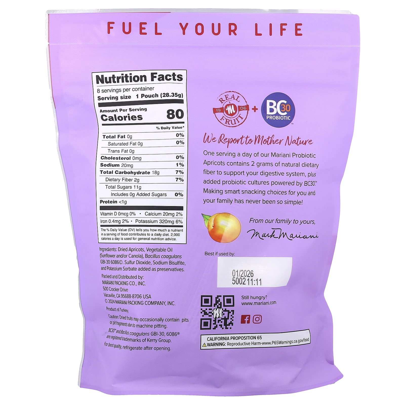 Damascos secos, óleo vegetal (girassol e/ou canola), Bacillus coagulans GBI-30 60860@. dióxido de enxofre, bissulfito de sódio, e sorbato de potássio adicionado como conservante.