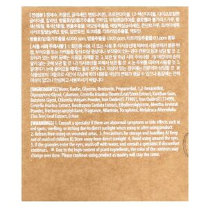 Água, caulim, glicerina, bentonita, propanediol, 1,2-hexanediol, dimetildietilenoglicol, calamina, extrato da flor/folha/caule de Centella asiatica, goma xantana, butilenoglicol, Chlorella vulgaris em pó, óxidos de ferro (CI 77492), óxidos de ferro (CI 77499), extrato de Centella asiatica, extrato de Houttuynia cordata, ethylhexylglycerin, pó de mentha arvensis, triethoxycaprylylsilane, fragrância, alantoína, tocoferol, extrato da folha de Melaleuca alternifolia (melaleuca), ectoin.