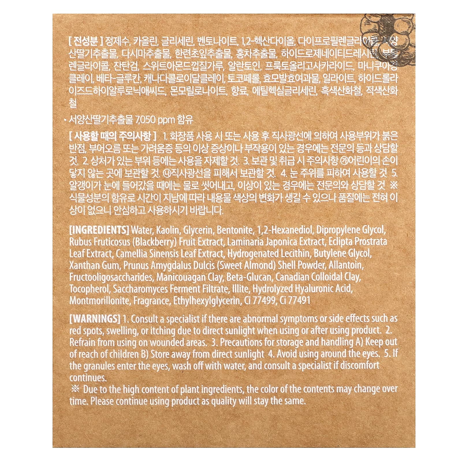 Água, caulim, glicerina, bentonita, 1,2-hexanediol, dimetildietilenoglicol, extrato da fruta de Rubus fruticosus (amora), extrato de Laminaria japonica, extrato da folha de Eclipta prostrata, extrato da folha de Camellia sinensis, hydrogenated lecithin, butilenoglicol, goma xantana, pó da casca de Prunus amygdalus dulcis (amêndoa doce), alantoína, fruto-oligossacarídeos, argila manicuagã, betaglucano, argila coloidal canadense, tocoferol, filtrado de fermento de Saccharomyces, illite, ácido hialurônico hidrolisado, montmorillonite, fragrância, ethylhexylglycerin, CI 77499, ci 77491.