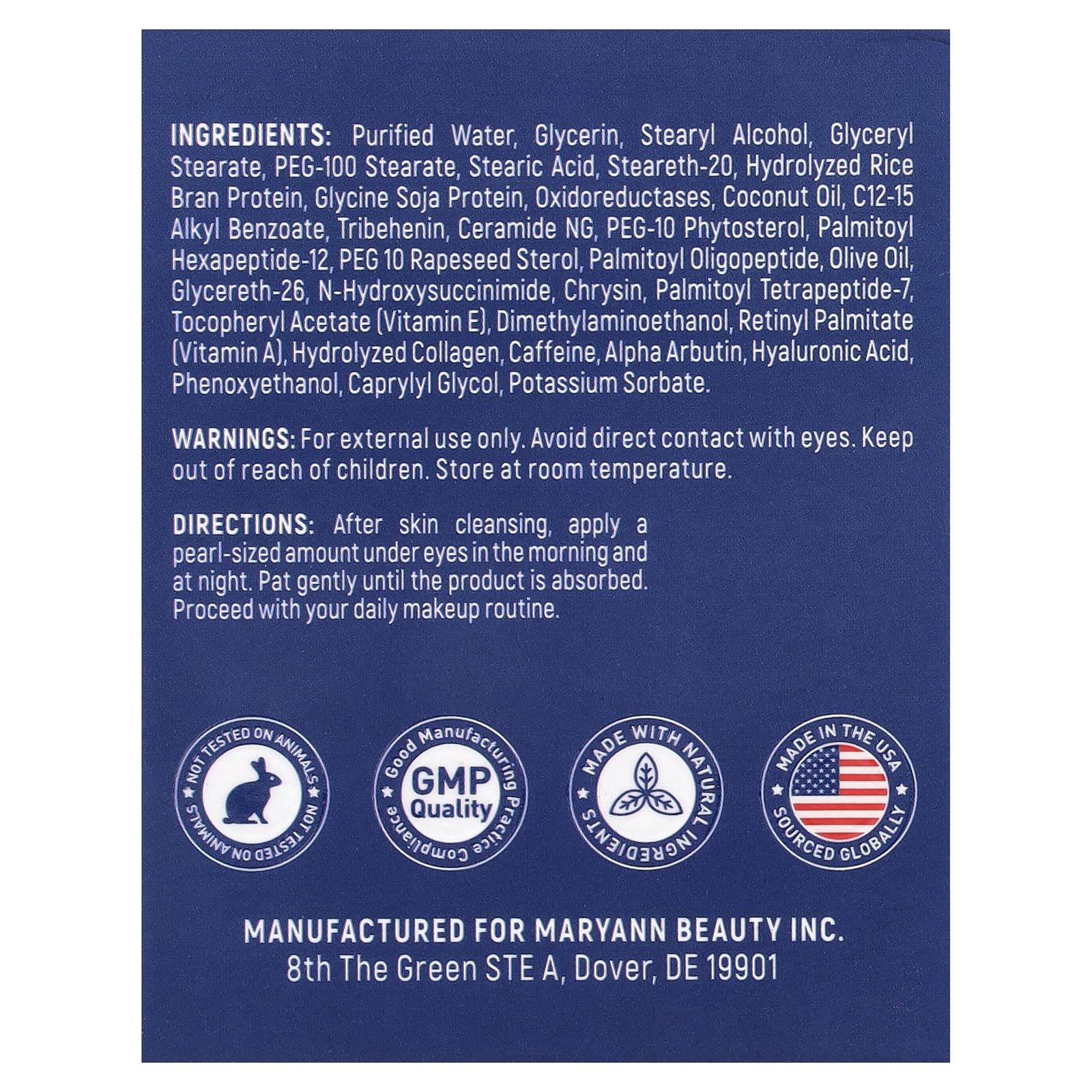 Água purificada, glicerina, álcool estearílico, monoestearato de glicerila, estearato de PEG-100, ácido esteárico, steareth-20, proteína do farelo de arroz hidrolisada, proteína de glicina de soja, oxidoredutases, óleo de coco, c12-15 alkyl benzoate, tribohenin, ceramida ng, fitosterol peg-10, palmitoyl hexapeptide-12, peg 10 esterol de colza, palmitoyl oligopeptide, óleo de oliva, glycereth-26, n-hydroxysuccinimide, crisina, palmitoyl tetrapeptide-7, acetato de racealfatocoferol (vitamina E), deanol, palmitato de retinol (vitamina A), colágeno hidrolisado, cafeína, alfa arbutina, ácido hialurônico, fenoxietanol, caprylyl glycol, sorbato de potássio.