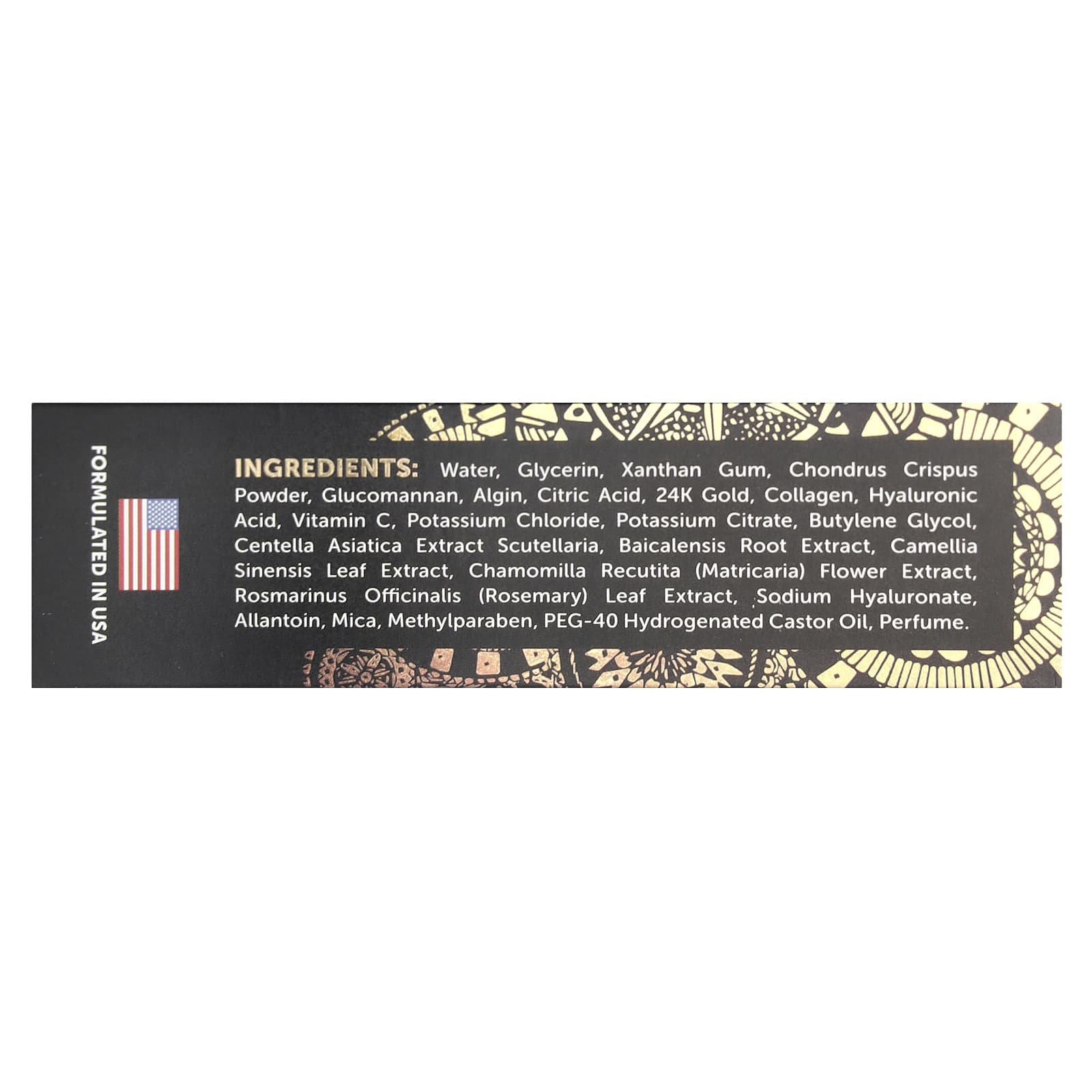 Água, glicerina, goma xantana, pó de Chondrus crispus, glucomannan, algina, ácido cítrico, ouro 24k, colágeno, ácido hialurônico, vitamina C, cloreto de potássio, citrato de potássio, butilenoglicol, extrato de Centella asiatica e Scutellaria, extrato da raiz de baicalensis, extrato da folha de Camellia sinensis, extrato da flor de Chamomilla recutita (matricária), extrato da folha de Rosmarinus officinalis (alecrim), hialuronato de sódio, alantoína, mica, metilparabeno, óleo de rícino hidrogenado peg-40, perfume.